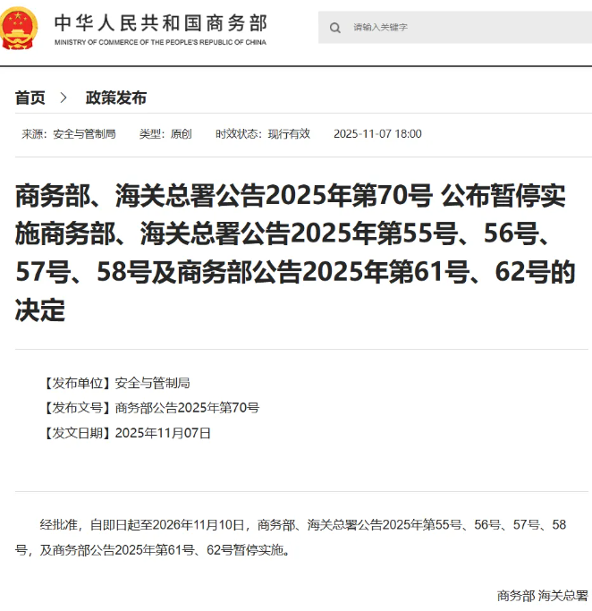 These suspensions by the two ministries represent a key step following consensus reached in Sino-US trade talks in Kuala Lumpur. China will suspend the export controls announced on October 9 for one year and will develop detailed implementation plans. These policy adjustments are expected to not only benefit the relevant industries but also positively impact the stability of global industrial and supply chains.