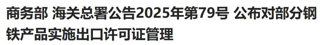 On December 12, 2025, the official website of the General Administration of Customs published Announcement No. 79 of 2025, jointly issued by the Ministry of Commerce and the General Administration of Customs, announcing the implementation of export license management for certain steel products. The policy will officially take effect on January 1, 2026.