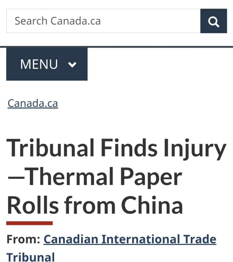 On January 8, 2026, the Canadian International Trade Tribunal (CITT) formally ruled that thermal paper rolls from China were being dumped and subsidized, causing material injury to the domestic Canadian industry.